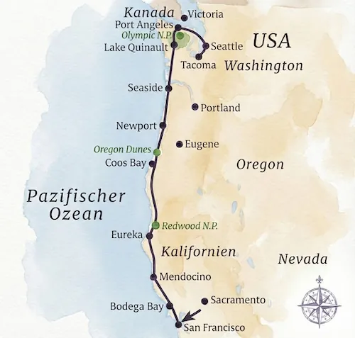 Der ultimative Roadtrip für Entdecker, der die Metropolen Seattle und San Francisco mit unberührter Natur verbindet.