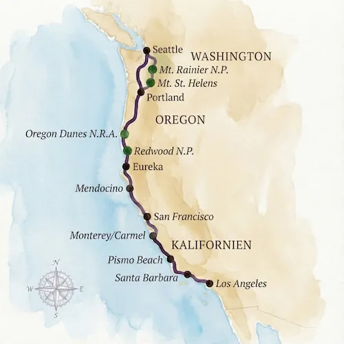 Der ultimative Roadtrip, der Seattle, San Francisco und Los Angeles mit unvergesslichen Naturwundern verbindet.
