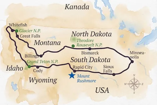 Von Mount Rushmore über Yellowstone und Glacier bis zu den historischen Stätten des Wilden Westens.