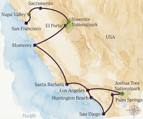 Eine umfassende Entdeckungsreise durch alle Facetten des Golden State – von den Bergen über die Wüste bis zum Meer.