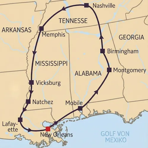 Die große Musik- und Kulturrunde ab New Orleans: Erleben Sie Jazz, Blues, Country und die Geschichte der Bürgerrechtsbewegung.