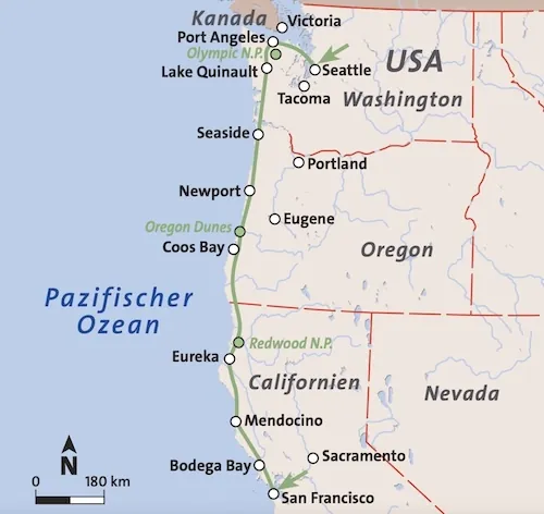 Vom mystischen Olympic Nationalpark über die raue Küste Oregons bis zu den höchsten Bäumen der Welt im Redwood Nationalpark.