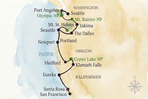 Eine große Rundreise durch die Naturwunder des Pazifischen Nordwestens bis nach Nordkalifornien.