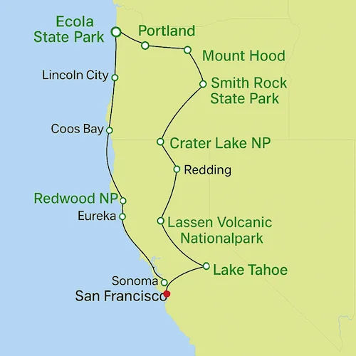 Erleben Sie Lake Tahoe, den tiefblauen Crater Lake, die Redwood-Wälder und die Metropole Portland.