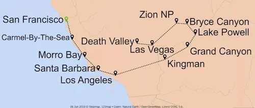 Eine Reise von San Francisco entlang der kalifornischen Küste zu den großen Canyon-Nationalparks.