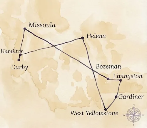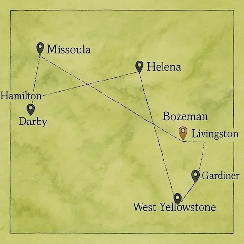 - Fahrzeiten (Richtwerte): Bozeman → Helena ≈ 1 h 45 min; Helena → Bozeman ≈ 1 h 45 min.